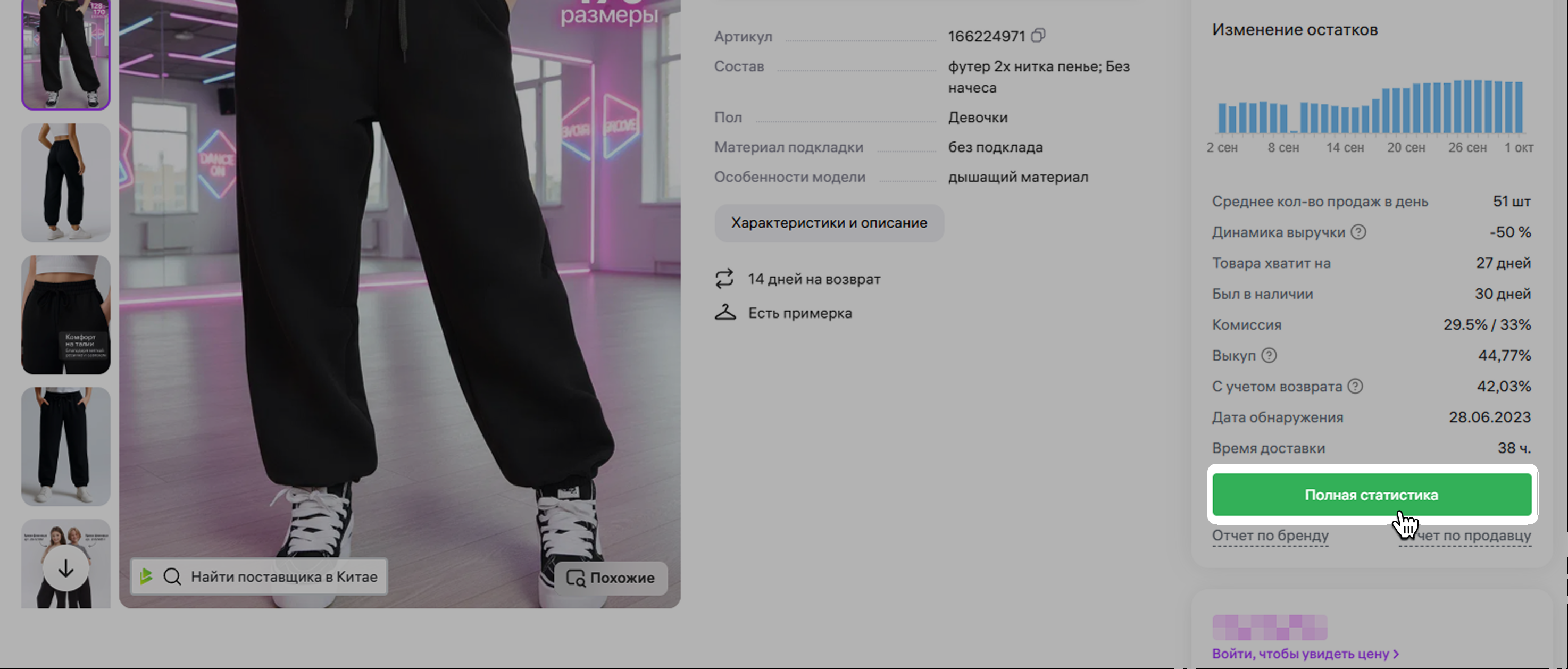 Нажмите Полная статистика, чтобы посмотреть подробную аналитику товара в STATS. Подробнее об этом читайте в статье Поиск по SKU.