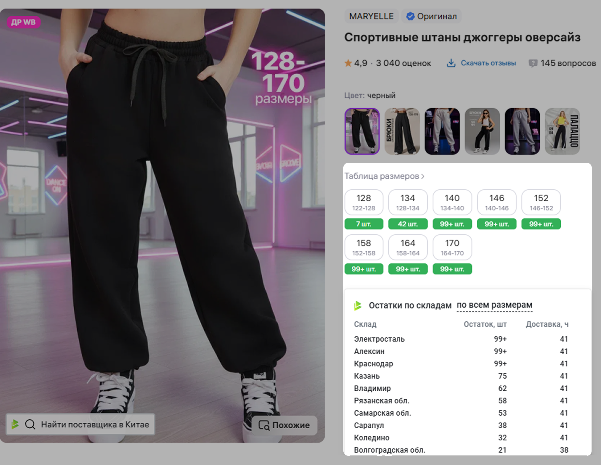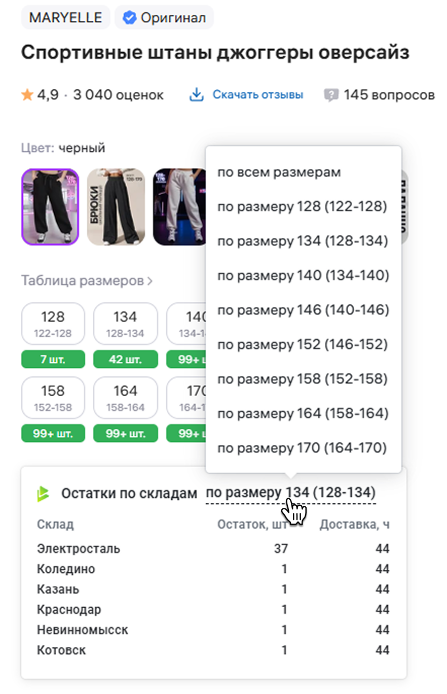 Плагин показывает количество остатков размерных товаров поштучно и распределение их по складам. Это поможет понять, какие склады используют конкуренты, и взять их на вооружение.