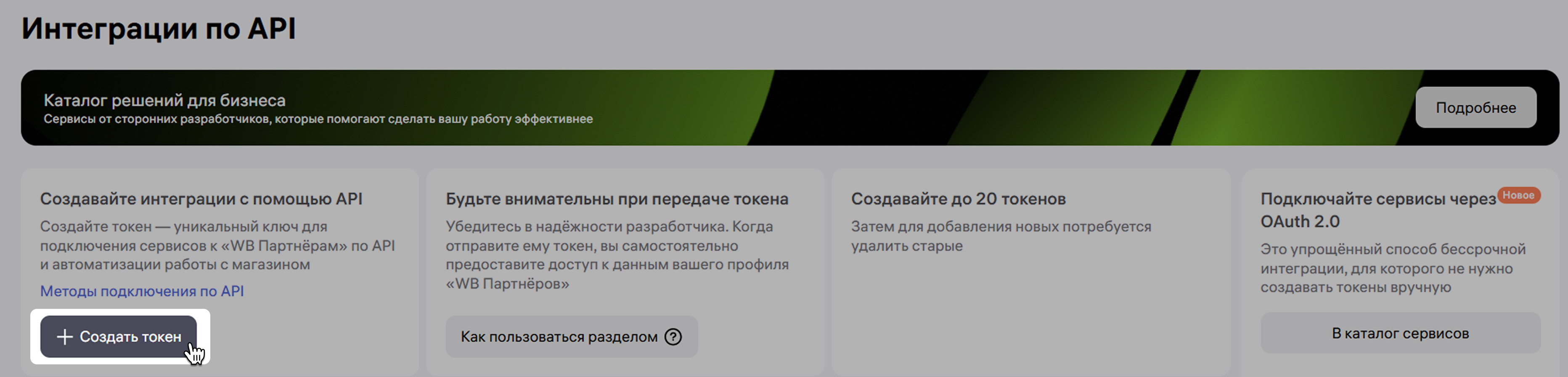 Зайдите в Кабинет селлера на WB. Нажмите на кнопку с названием магазина. Перейдите в раздел Интеграции по API.