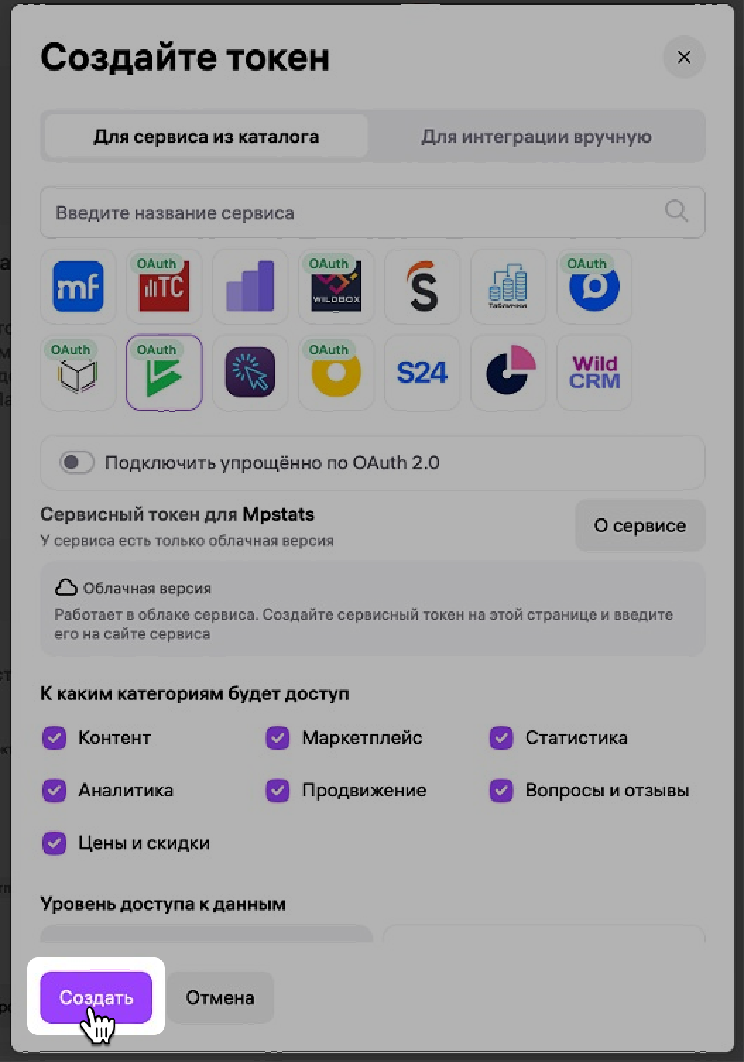 Отметьте галочками категории, к которым нужен доступ: Контент, Маркетплейс, Статистика, Аналитика, Вопросы и отзывы, Цены и скидки.