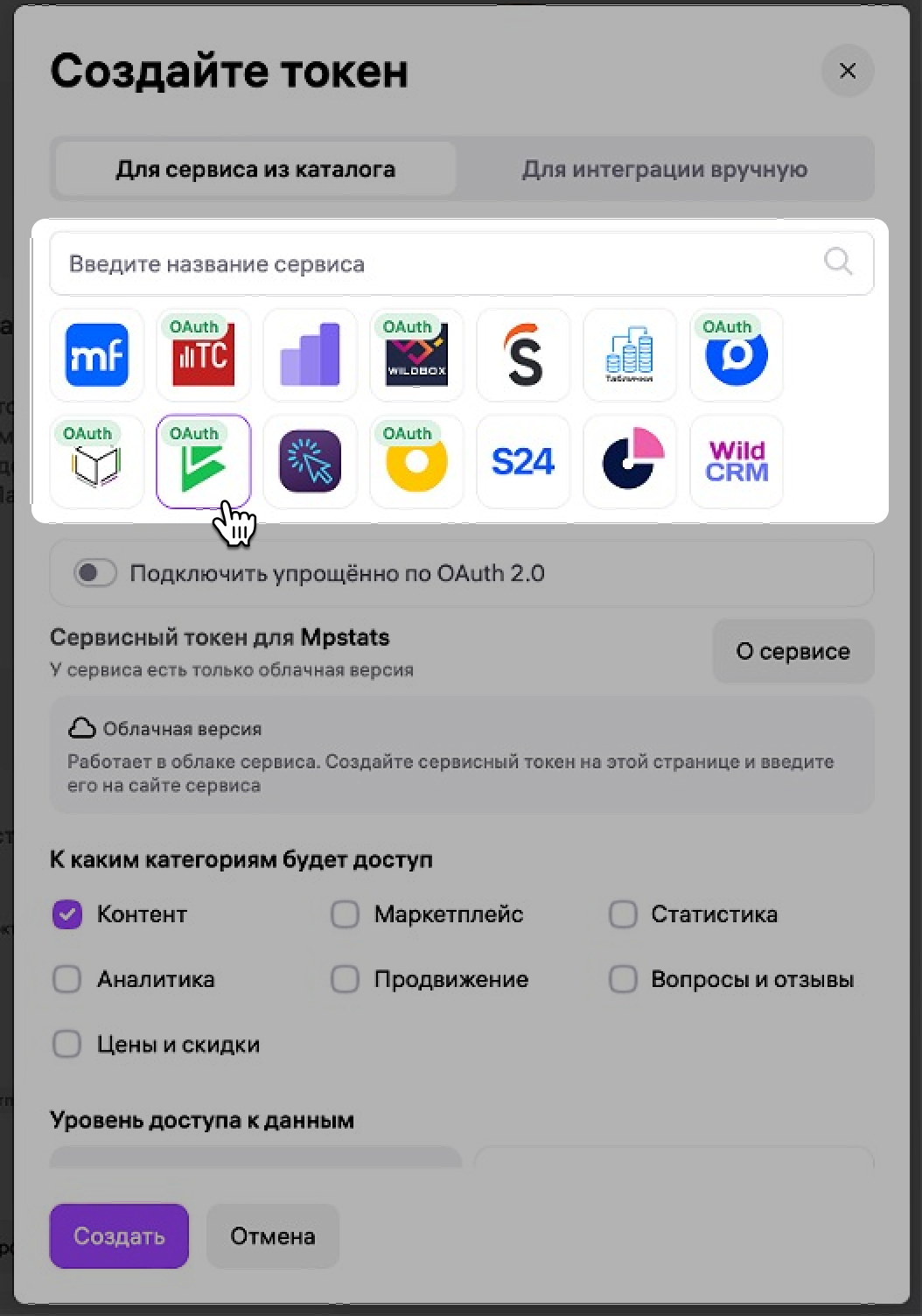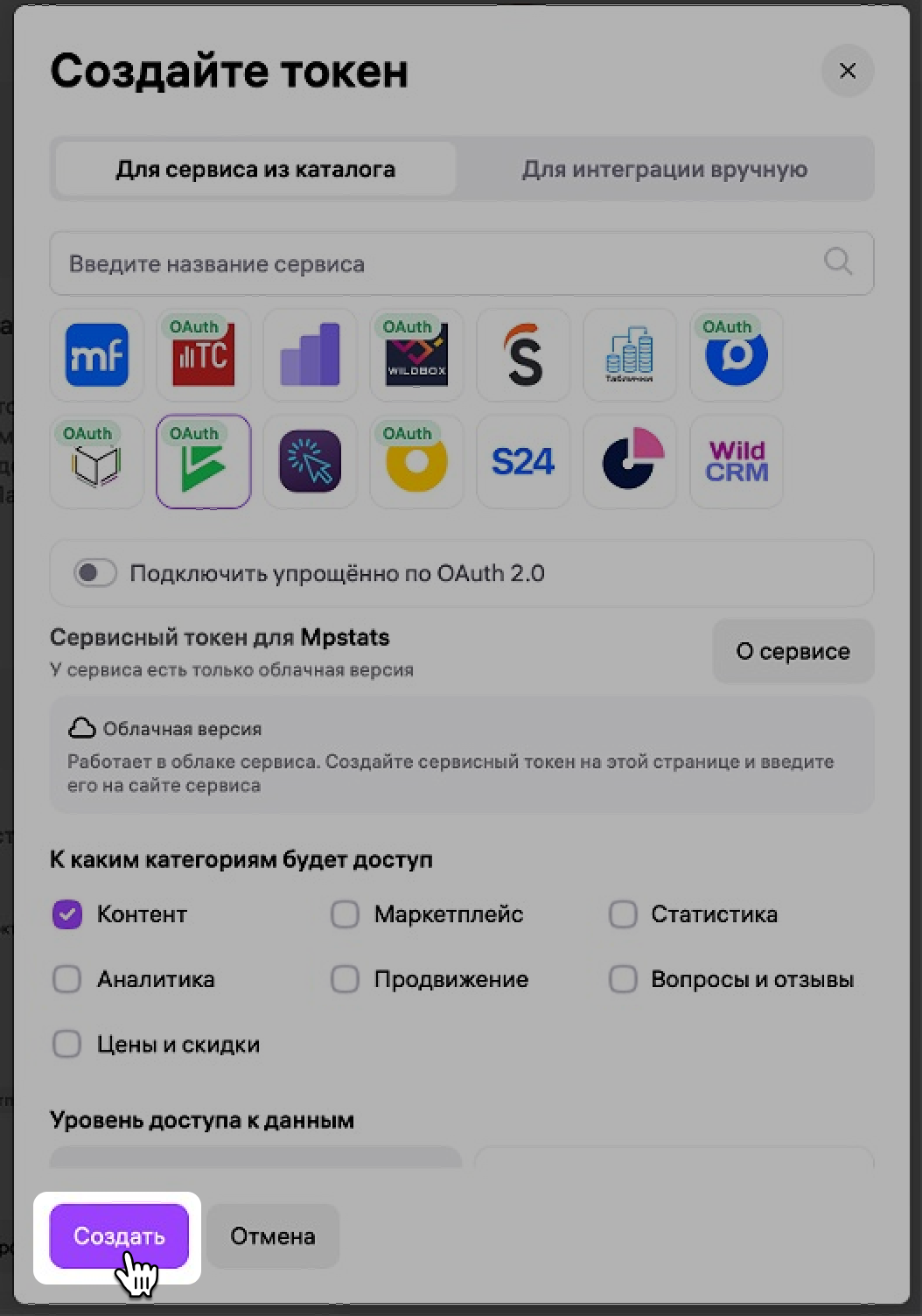 - у токена выбран метод API Контент