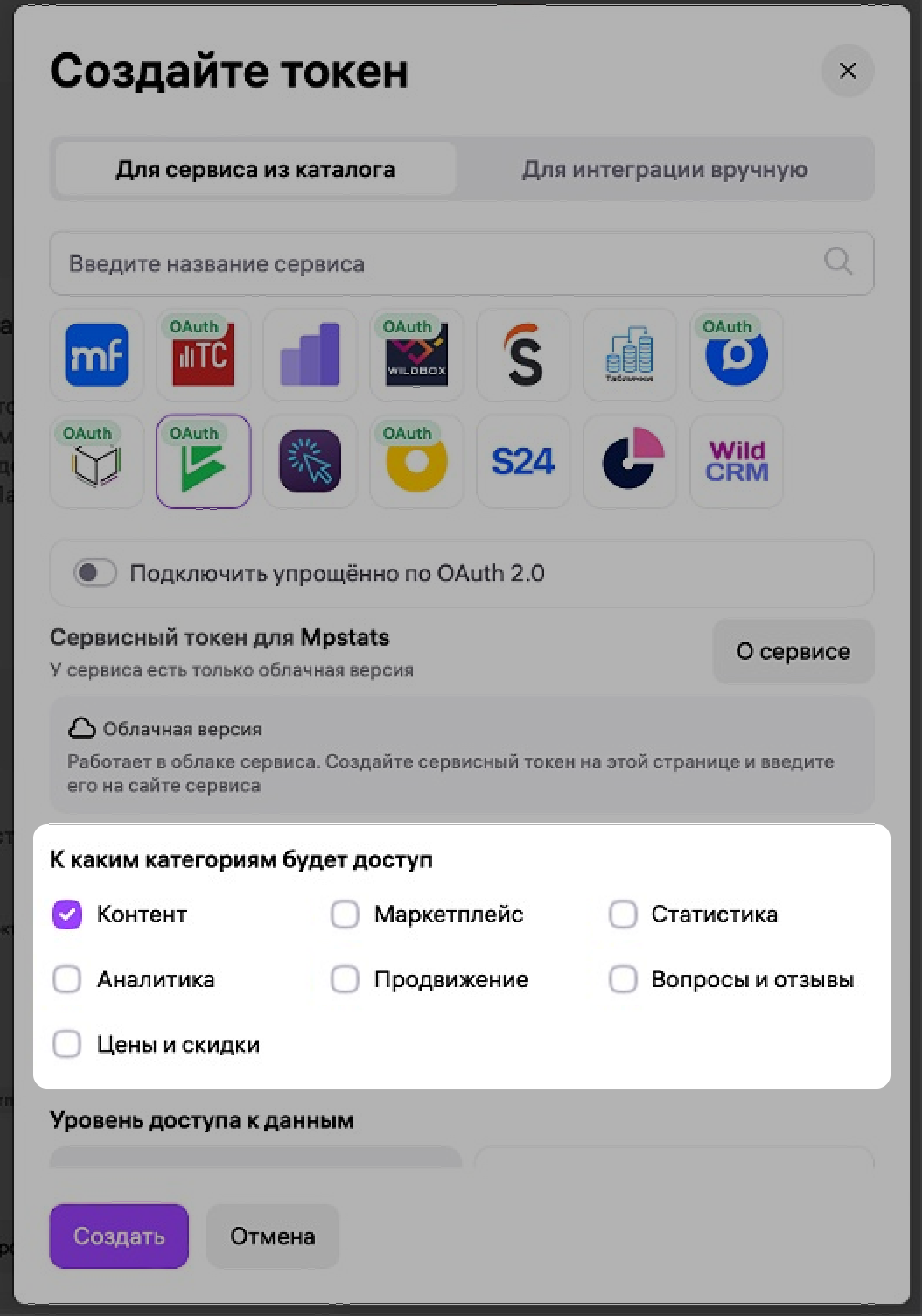 Отметьте галочкой категорию, к которой нужен доступ – Контент.