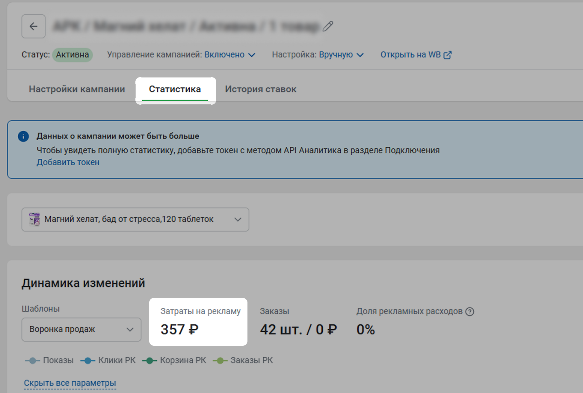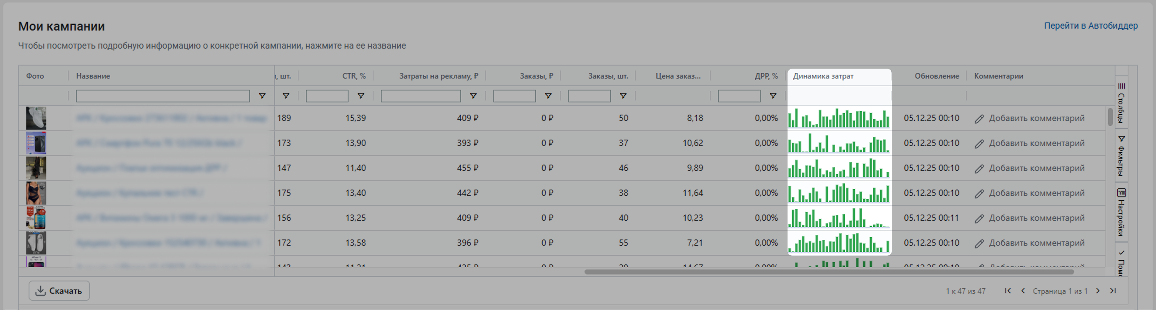 Рекламная статистика собрана в Журнале продвижения. В блоке Мои кампании показаны все ваши рекламные кампании из WB Продвижение. В таблице вы найдете столбец Динамика затрат – в нем отражаются расходы на продвижение за каждый день.
