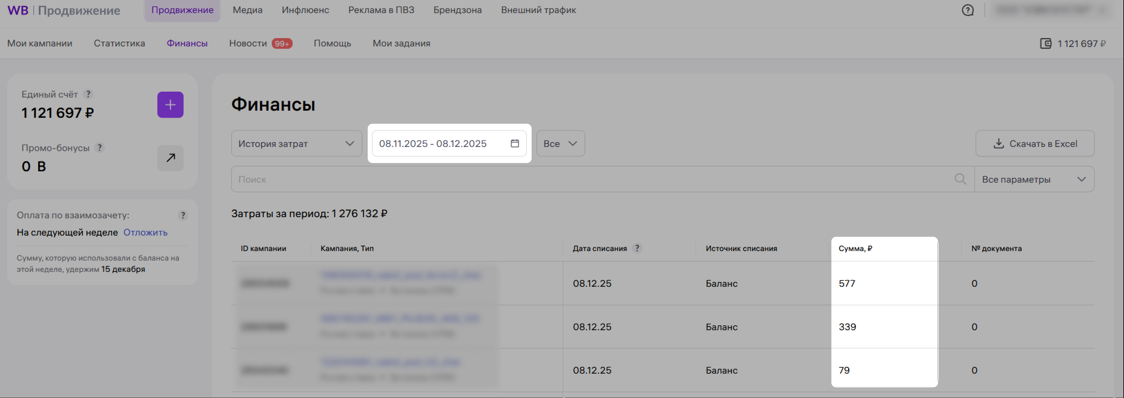 Эти данные мы берем из раздела Статистика на WB Продвижение, столбец Затраты. Чтобы сверить суммы затрат, выберите одинаковые периоды на WB Продвижение и в Журнале продвижения.