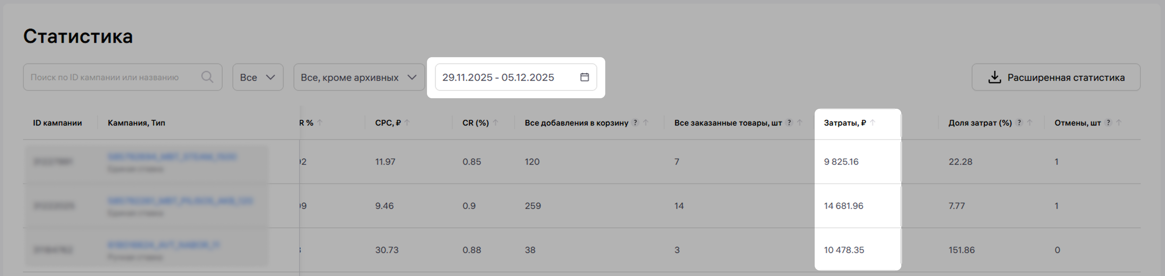 Общую сумму затрат на кампанию за выбранный период показывает столбец Затраты на рекламу.