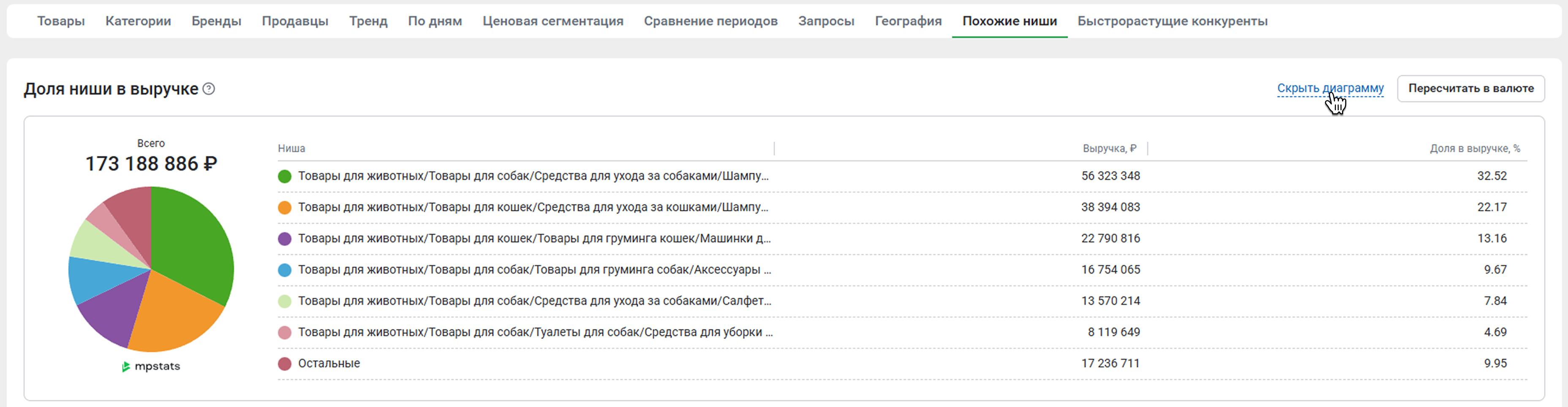 На диаграмме показано, как распределяется выручка между всеми похожими нишами. В таблице справа от диаграммы приводим список ниш, суммарную выручку по ним и долю в общей выручке.