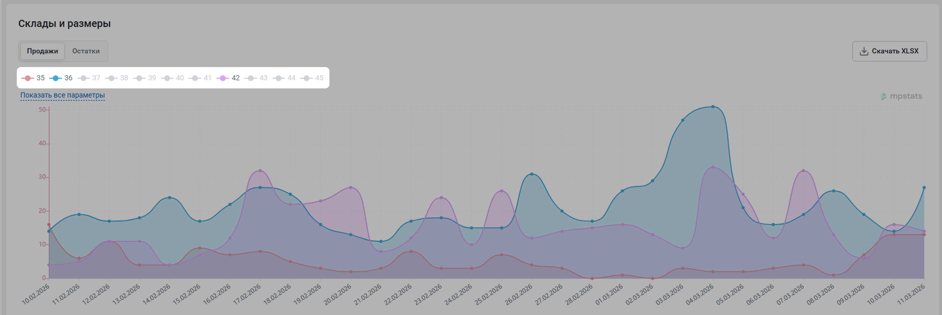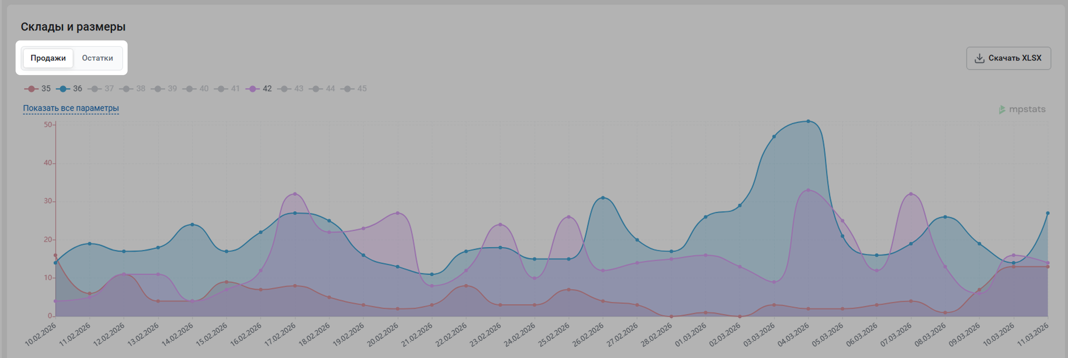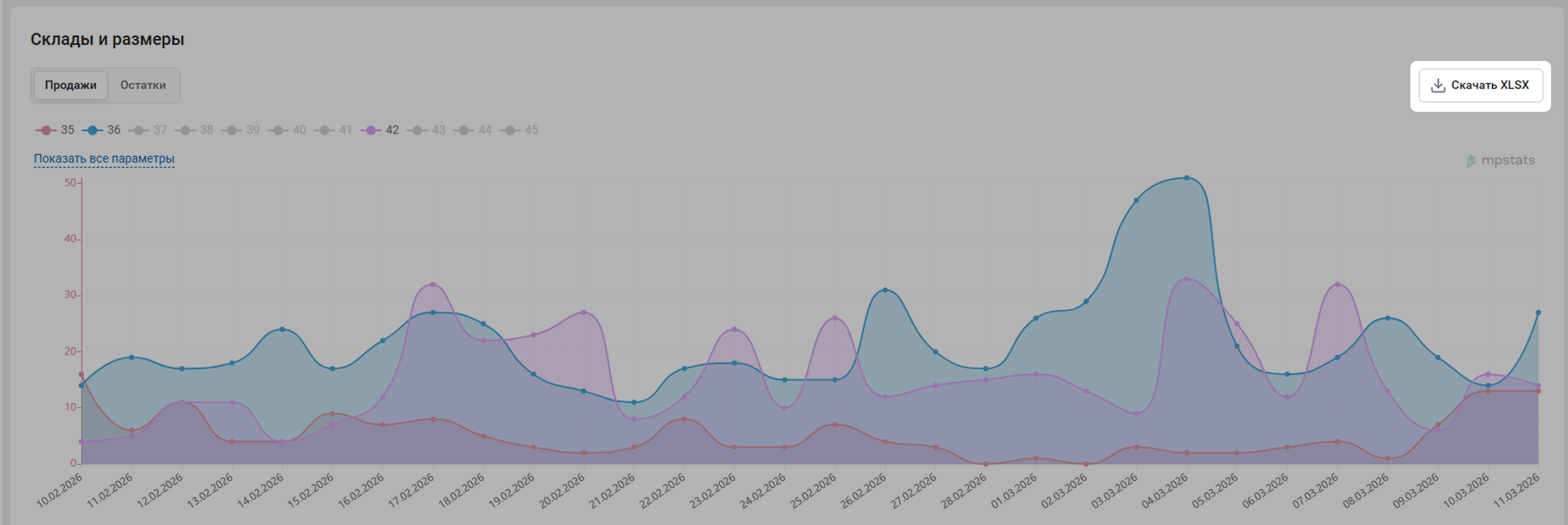 В отчете в виде графика показаны продажи по дням с определенных складов и разных размеров. Нажмите на название показателя, чтобы отобразить его на графике или скрыть.